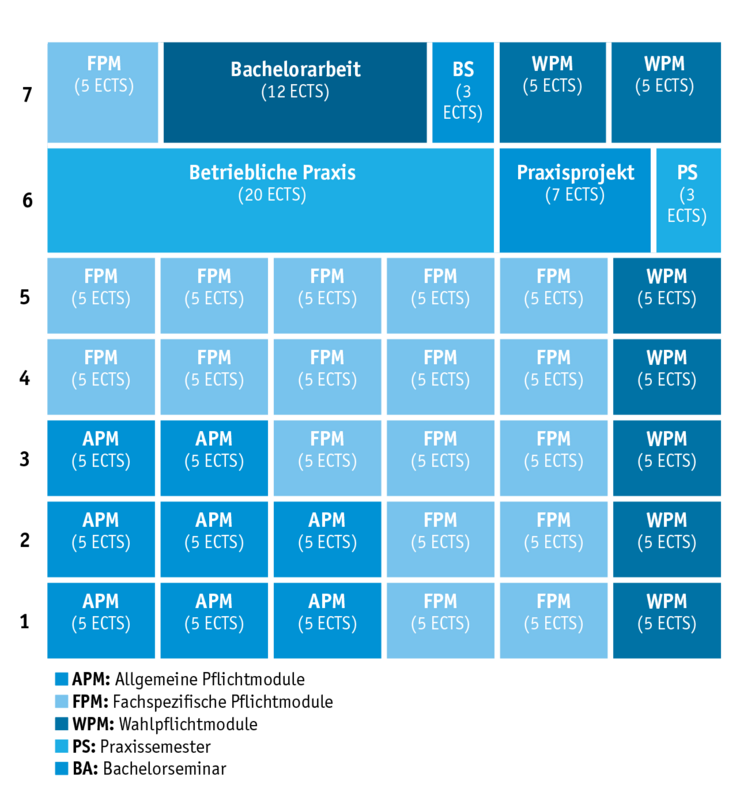 Das Studium dauert in der Regel sieben Semester, mit dem Praktikum im sechsten und der Bachelorarbeit im letzten Semester.