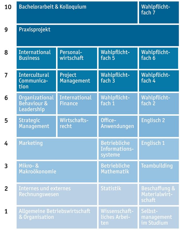 Die Studieninhalte entsprechen einem anspruchsvollen Curriculum für Internationale Betriebswirtschaftslehre. Die Internationale Komponente wird neben dem Fächerkanon auch dadurch sichergestellt, dass ein Teil der Kurse in englischer Sprache unterrichtet wird. Im Grundstudium werden die sprachlichen Kenntnisse erarbeitet bzw. ausgebaut und das international anerkannte TOEIC-Zertifikat erworben (TOEIC = Test of English for International Communication). Im Hauptstudium werden dann darauf aufbauend Vorlesungen in englischer Sprache gehalten und auch ausländische Dozierende eingesetzt.
