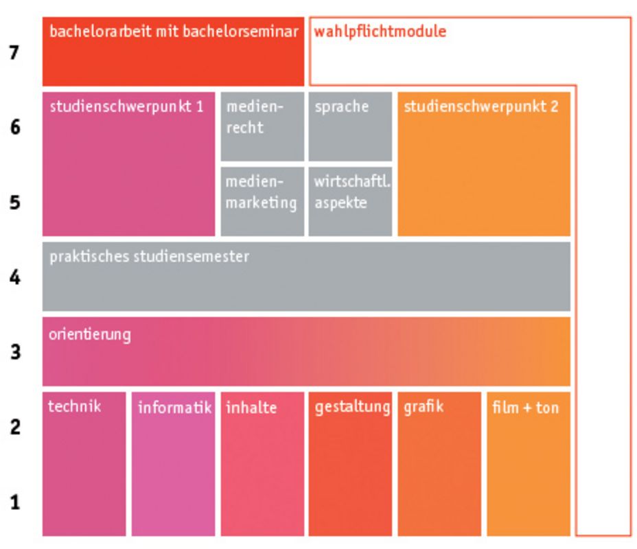 Zusätzlich wird im 5. und 6. Semester unternehmerische und betriebliche Kompetenz durch die Module Medienrecht, und wirtschaftliche Aspekte vermittelt. Im 7. Semester schließen die Bachelorarbeit und das Bachelorseminar das Studium ab.