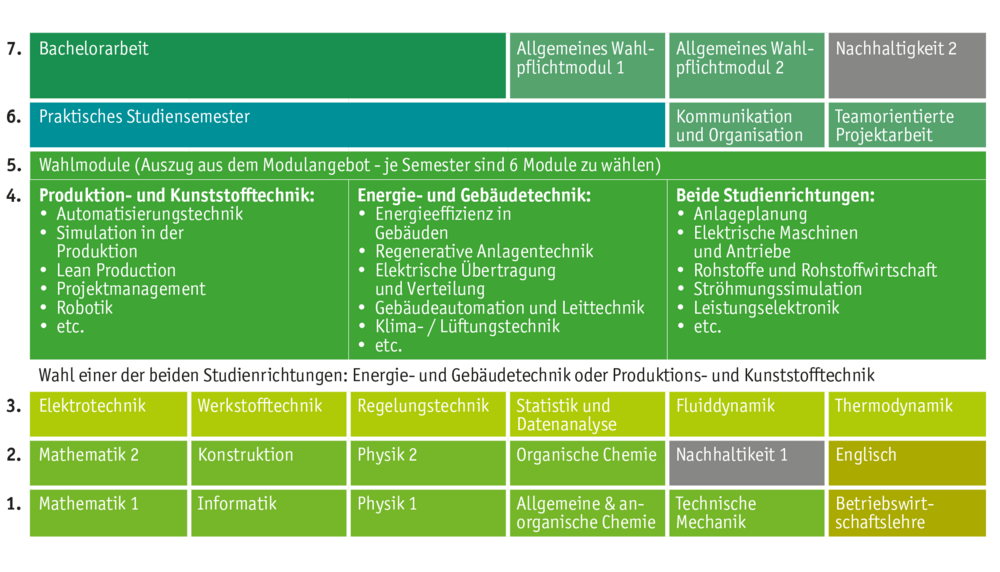 Dein Bachelor-Studium umfasst sieben Fachsemester. In den ersten drei Semestern lernst du v.a. bedeutende ingenieurwissenschaftliche Grundlagen kennen und erhältst einen Überblick über die vielfältigen Aspekte der Nachhaltigkeit. Mit Beginn des vierten Semesters entscheidest du dich für deine Studienrichtung und spezialisierst dich fortan in dieser.