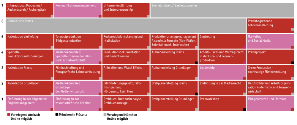 Der Aufbau des Studiums orientiert sich an den Phasen einer Medienproduktion: Beurteilung von Drehbüchern, Stoffentwicklung, Vorbereitung der Dreharbeiten/Pre-Production, Dreh, Nachbearbeitung/Postproduktion und Vermarktung. Die Schwerpunkte der Ausbildung liegen dabei auf den organisatorischen und finanziellen Bereichen der Produktion. Die Studierenden erhalten eine fundierte Ausbildung im allgemeinen Produktionsmanagement, die sie dazu befähigt, in leitender Funktion an medialen Produktionen zu arbeiten.