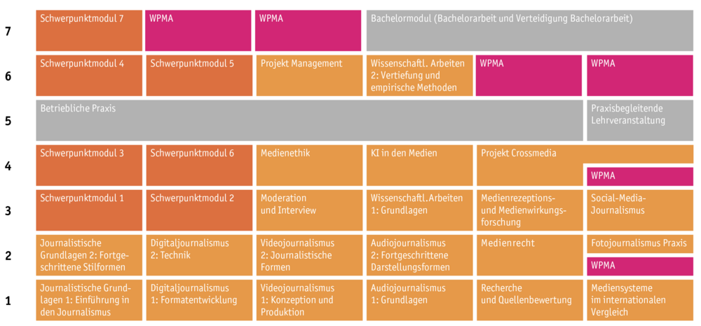 Im fünften Semester absolvieren die Studierenden ein journalistisches Langzeitpraktikum in einer Print-, Digital-, Social-Media-, TV- oder Hörfunkredaktion. Zum sechsten Semester kehren sie von ihren Praktikumsstellen an die Hochschule zurück und erwerben weitere ressortspezifische Kenntnisse in einem der gewählten Schwerpunkte und in den jeweiligen Projektmodulen. Den Abschluss des Studiums bildet das Bachelormodul mit der schriftlichen Bachelorarbeit und der mündlichen Verteidigung, bevor den Studierenden der Titel „Bachelor of Arts“ verliehen wird.