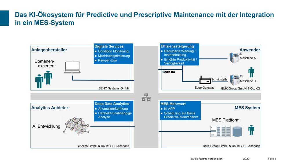 In dem KI-Ökosystem sollen intelligente und modulare KI-Algorithmen für Predictive / Prescriptive Maintenance sowohl für Anlagenhersteller als auch -betreiber zur Verfügung gestellt werden. Dabei wird insbesondere ein standardisierter Ansatz für die Integration der Maschinen und IT-Systeme verfolgt, sodass die Produktionsumgebung auch bei Anpassungen und Erweiterungen im KI-Ökosystem abgebildet werden kann.