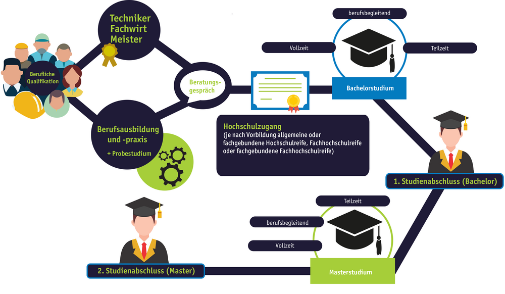 Ein Studium durch berufliche Qualifikation eröffnet vielfältige Chancen für Personen, die bereits einen Abschluss als Meister, Techniker oder Fachwirt erlangt haben. Diese beruflichen Qualifikationen, die häufig in berufsbegleitenden Fortbildungsprogrammen unter hohem Einsatz erworben werden, zeugen von umfassendem Fachwissen und praktischer Expertise und können somit als solide Grundlage für eine akademische Weiterbildung dienen.