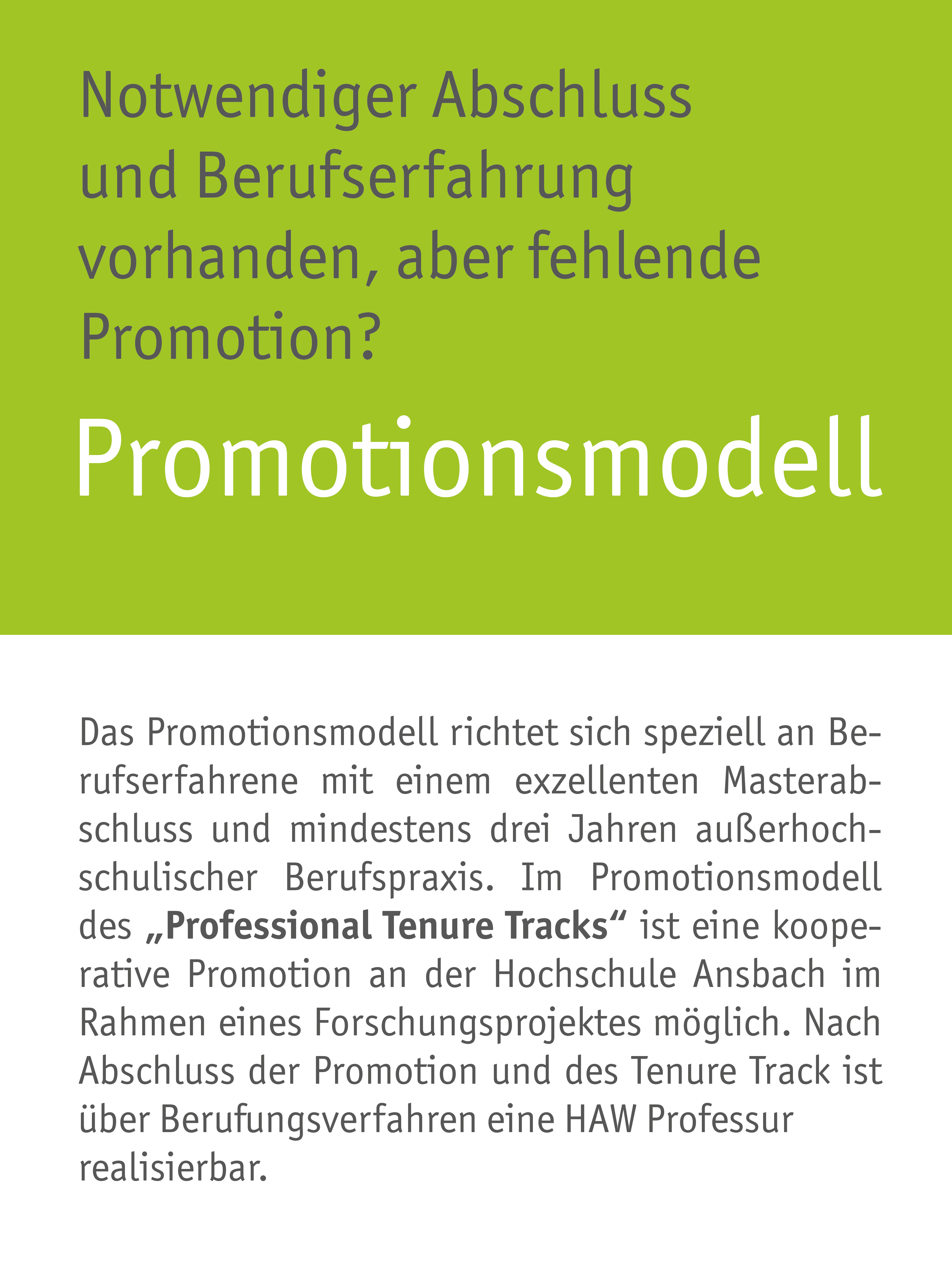 Für alle Nachwuchswissenschaftler:innen, die interessiert an einer Professur an der Hochschule Ansbach sind, bieten wir mit dem „Professional Tenure Track“-Programm die Möglichkeit, der Professur näher zu kommen. Die zwei am häufigsten anzutreffenden Gründe für ein Scheitern in einem Berufungsverfahren für wissenschaftlichen Nachwuchs an HAW sind das Fehlen einer Promotion oder einer mindestens 3-jährigen, nach Abschluss des Studiums und außerhalb des Hochschulbereichs, erbrachten beruflichen Praxis.