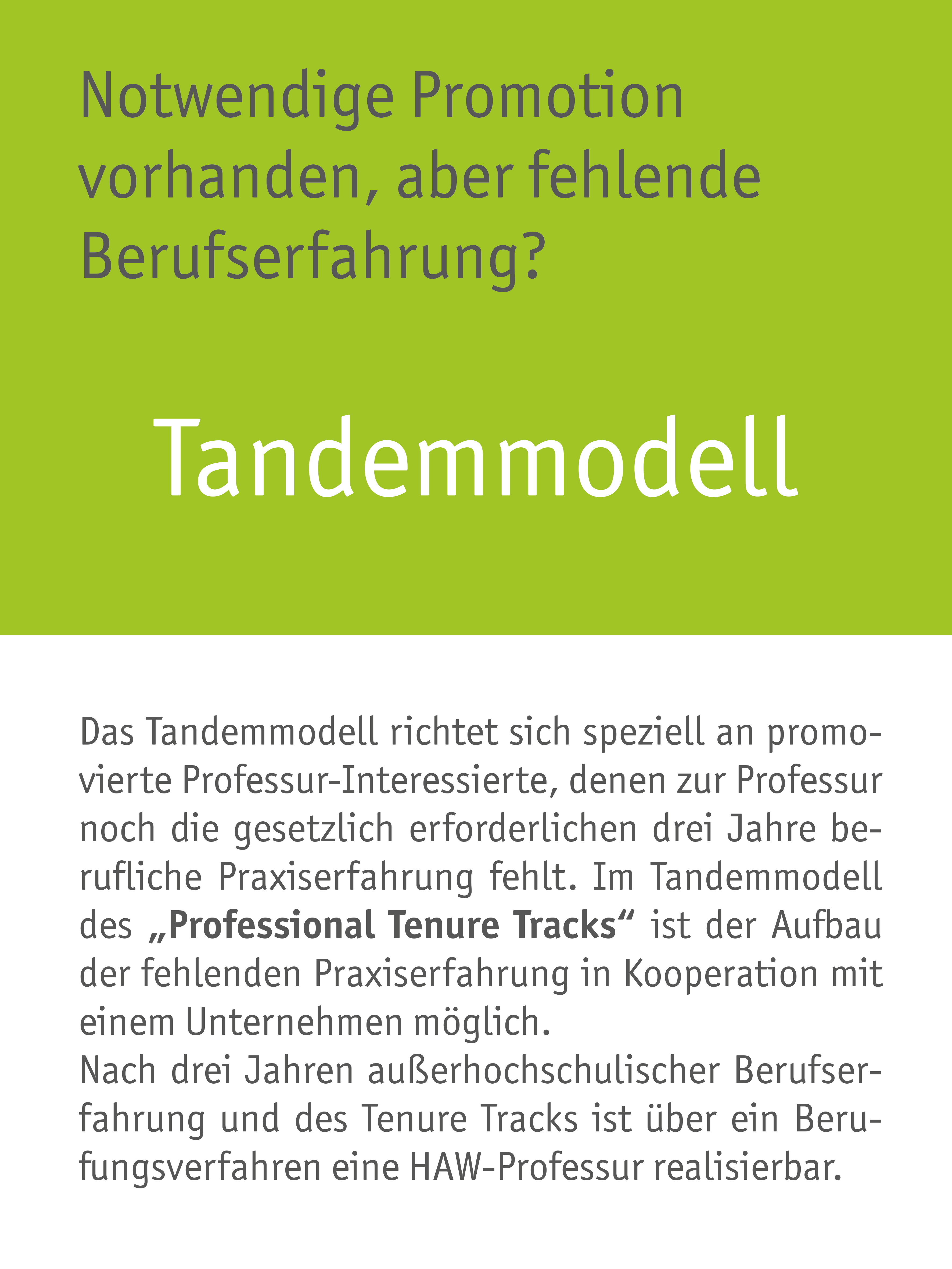 Das „Professional Tenure Track“-Programm bietet hier die Möglichkeit, mit Unterstützung durch die Hochschule Ansbach, die jeweils fehlende Schlüsselqualifikation zu erwerben. Für jede dieser beiden nicht vorhandenen Qualifikationen gibt es ein jeweiliges Modell im „Professional Tenure Track“.