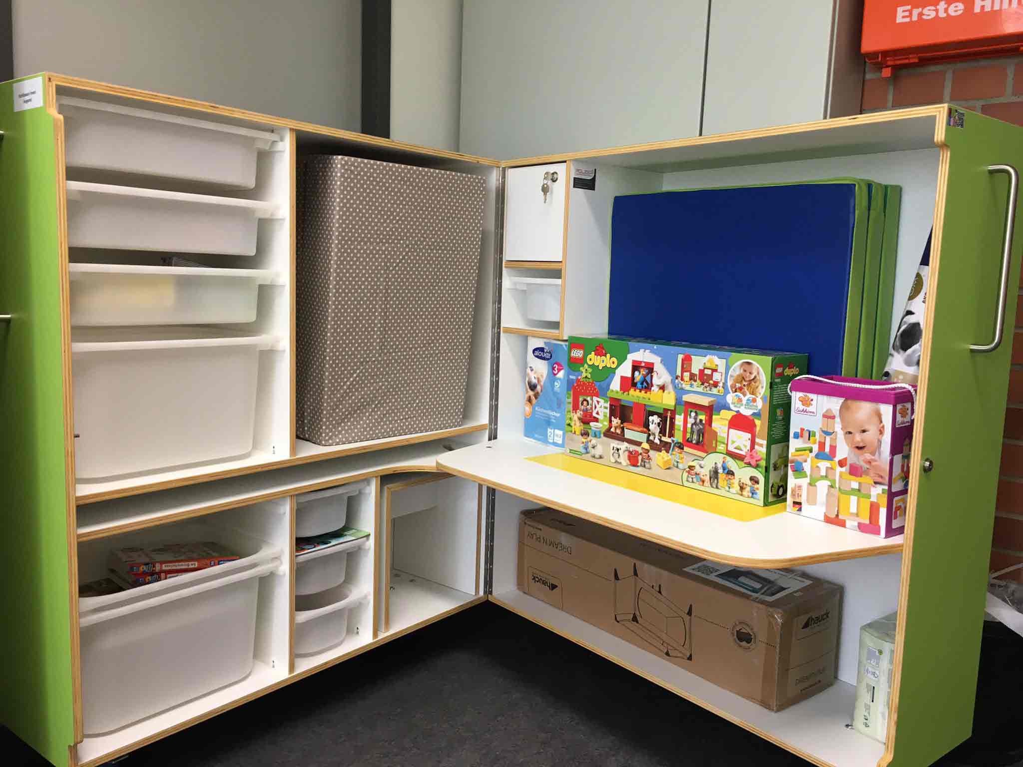 Im Zimmer befindet sich auch die KidsBox, eine Art mobiles Kinderzimmer, die gerne an den eigenen Arbeits- oder Lernplatz mitgenommen werden kann. Einen kleinen Einblick über den Inhalt der KidsBox erhalten Sie über den nachfolgenden Link: KidsBox
