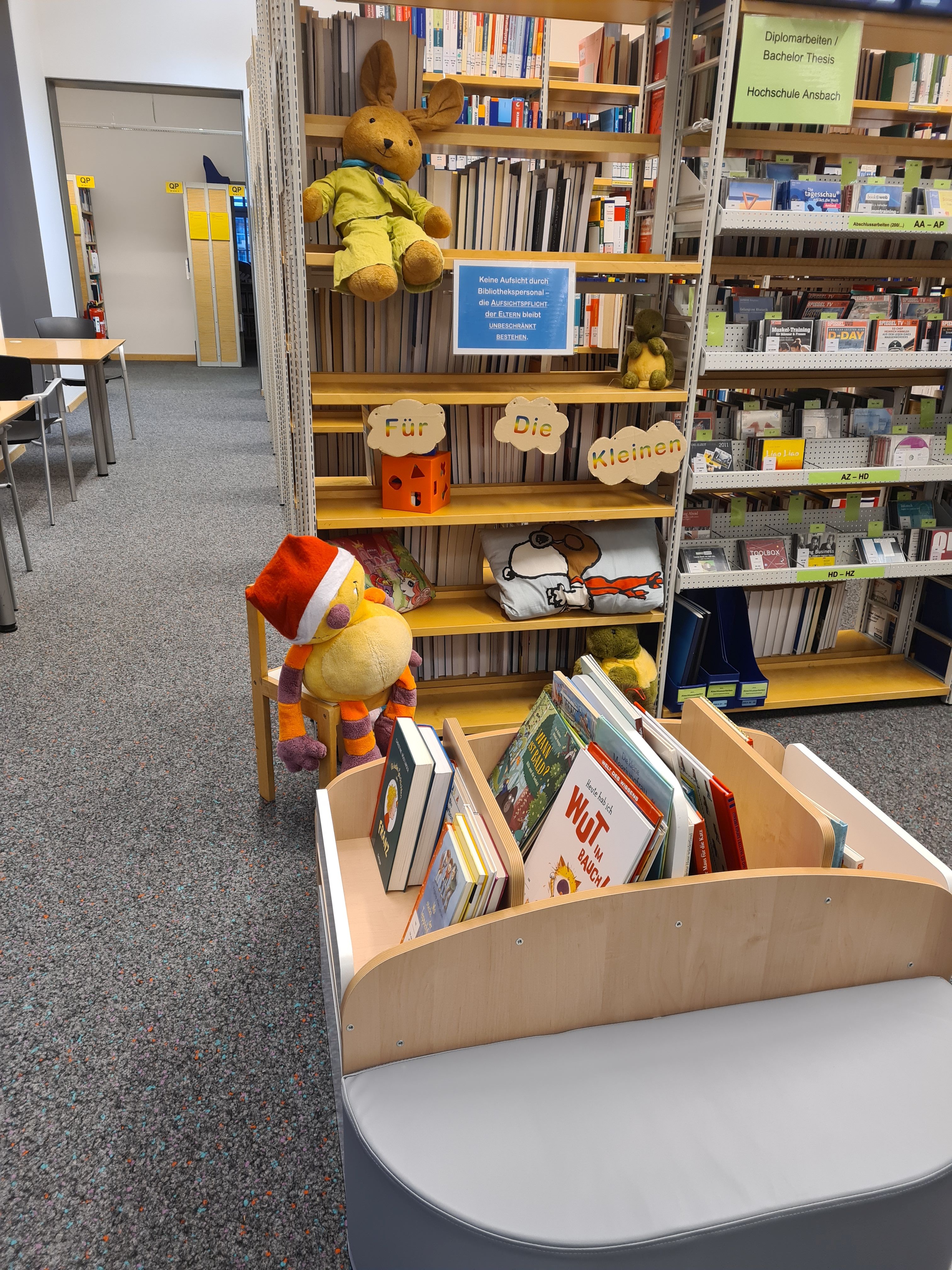 Für Kinder, die sich unter der Aufsicht ihrer Eltern in der Hochschulbibliothek aufhalten, stehen in der Kinderecke Bücher und Spielsachen zur Beschäftigung bereit. Eine Wickelmöglichkeit finden Sie in den nahegelegenen Toiletten der Hochschulbibliothek.