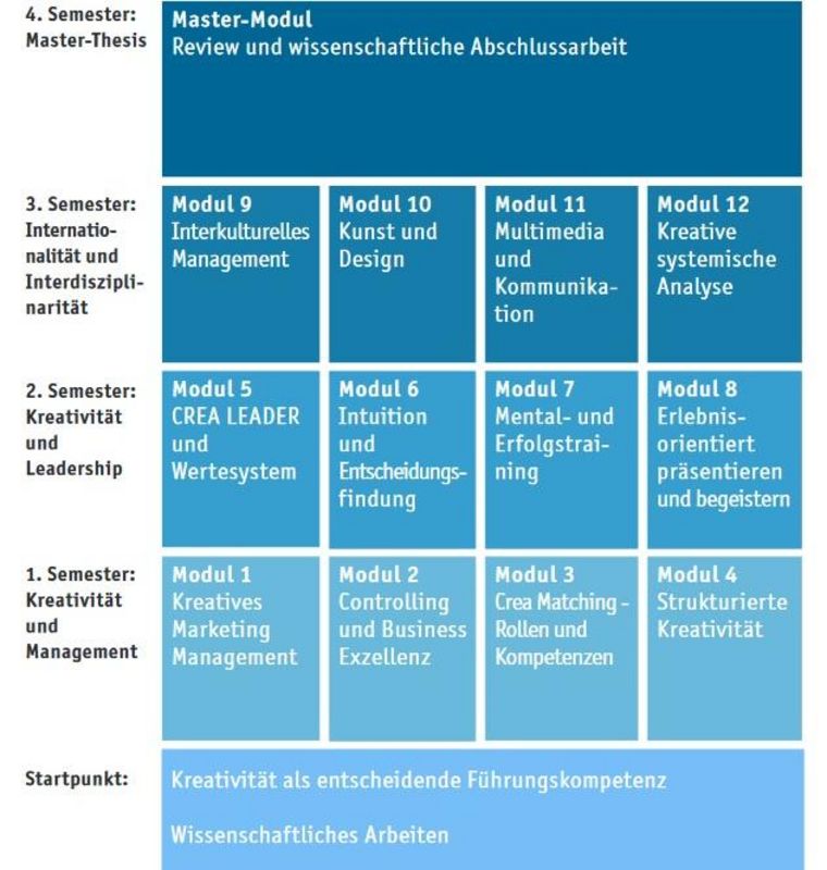 Das kreative MBA-Programm weist eine starke Praxisorientierung auf und fördert die Entwicklung der Management-, Leadership- und Innovationskompetenzen. Des Weiteren dient es der ganzheitlichen Persönlichkeitsentwicklung. Das Studium erweitert das Kompetenzspektrum der Teilnehmerinnen und Teilnehmer, um sie branchenübergreifend für höhere Management- und Führungsaufgaben zu qualifizieren.