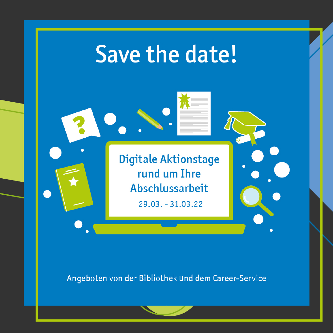 Vom 29. bis 31. März finden die digitalen Aktionstage rund um Ihre Abschlussarbeit statt. Die Bibliothek und der Career-Service bieten Ihnen ein vielfältiges Programm zum wissenschaftlichen Arbeiten an. Durch Kurzvorträge am Dienstag sowie intensive Crashkurse am Mittwoch und Donnerstag werden Sie optimal auf das Recherchieren, Schreiben und Zitieren für ihre Abschlussarbeit vorbereitet.
