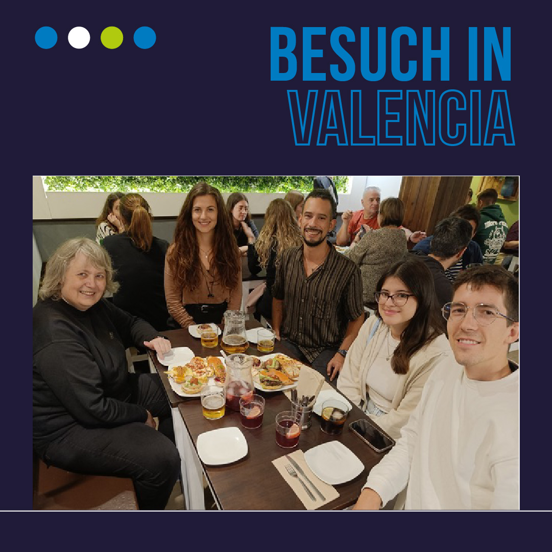 Beim „Ansbacher Stammtisch“ traf Prof. Hedderich Studierende aus Ansbach, die ein Auslandssemester in Valencia absolvieren. Neben ihren Vorlesungen im gemeinsam mit der UPV angebotenen Studiengang IPM und im Deutschprogramm nutzte sie die Zeit für Treffen mit dem International Office und dem Studierendenservice. Trotz Herausforderungen konnten die meisten Veranstaltungen erfolgreich stattfinden. Der Aufenthalt zeigt, wie wichtig persönlicher Austausch und hybride Formate für internationale Hochschulkooperationen sind.