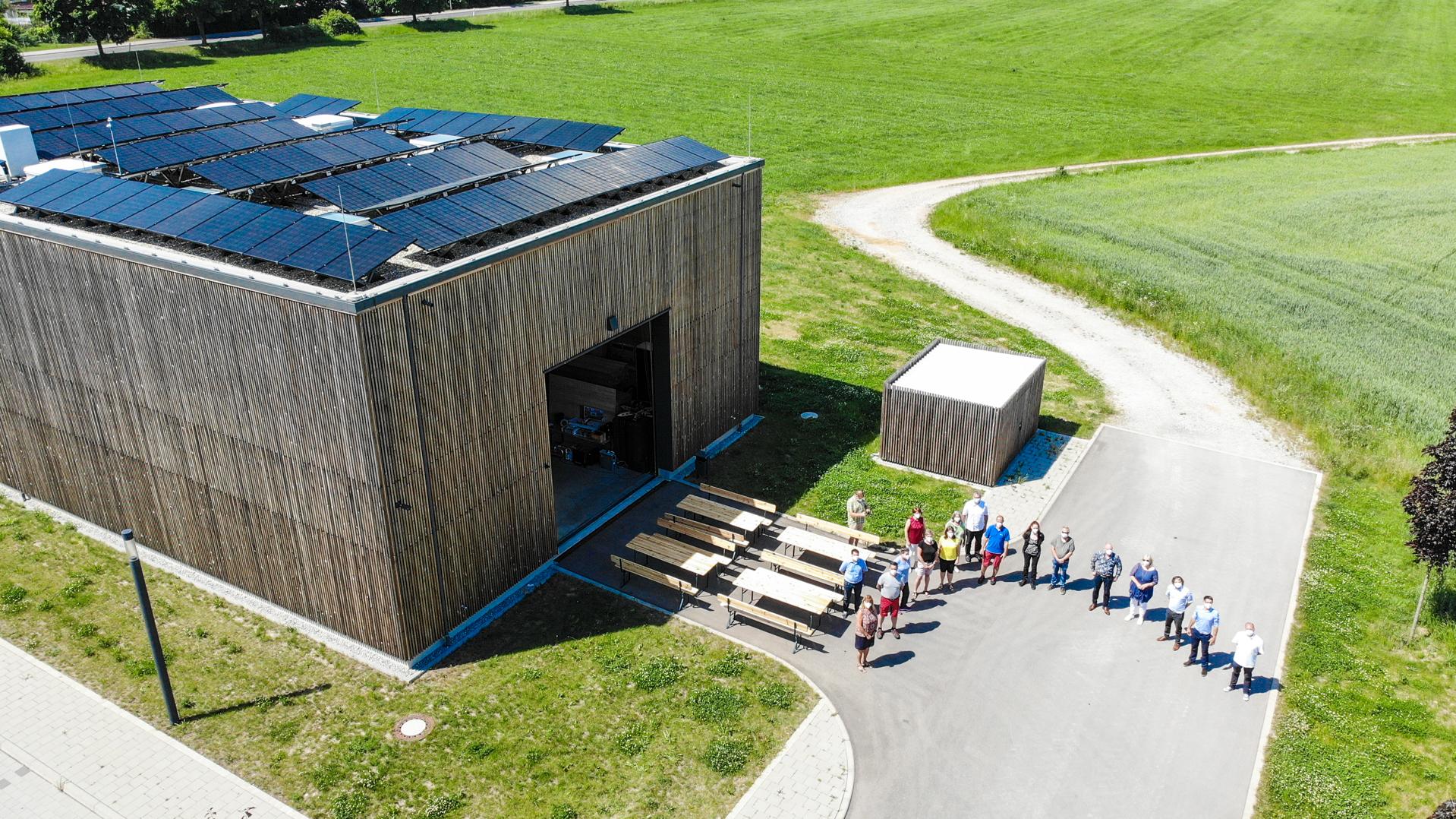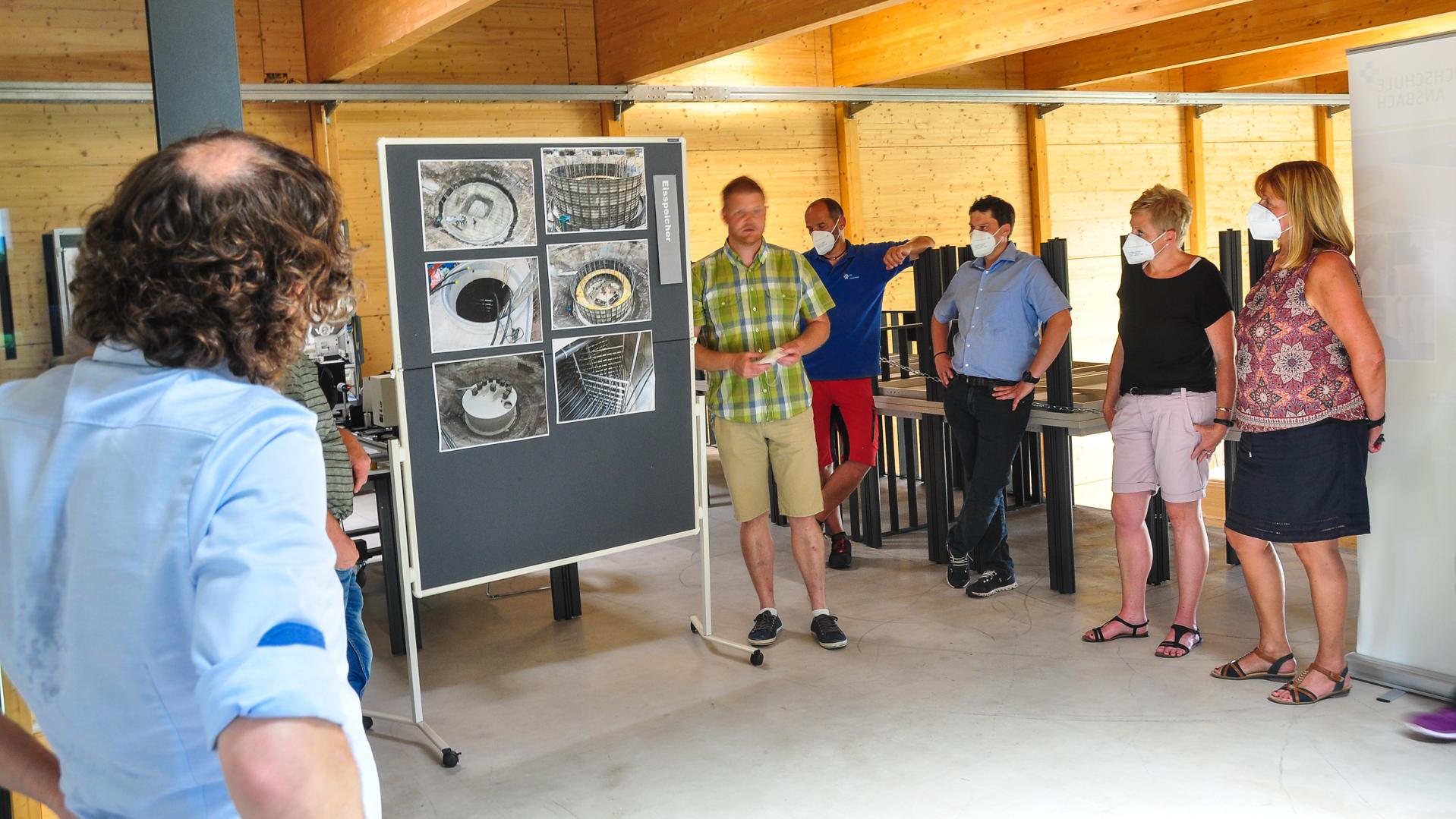 Am 16. Juni konnte der Campus Feuchtwangen zwölf interessierte Mitarbeitende aus der benachbarten Bayerischen BauAkademie begrüßen. Laboringenieur Oliver Abel führte die Gruppe zunächst durch das innovative Forschungsgebäude und erläuterte dessen technische Besonderheiten: „Das Gebäude ist ein Effizienzhaus Plus-Bildungsbau – d.h. die auf dem Dach montierte Photovoltaikanlage generiert mehr Energie, als wir jährlich verbrauchen. Die Wände sind in kombinierter Holzständer- und Holzrahmenbauweise errichtet. Die Außenfassade besteht aus unbehandeltem einheimischen Douglasien Holz und ist vollständig hinterlüftet.“
