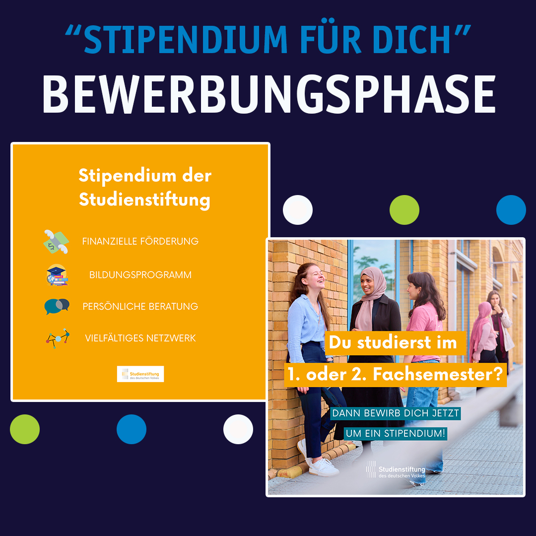 Wenn du aktuell im ersten oder zweiten Fachsemester eines grundständigen Studiengangs immatrikuliert bist, kannst du dich zwischen dem 09. Januar und dem 13. Februar 2025 selbst für das Programm bewerben. Alle relevanten Informationen sowie einen Link zum Bewerbungsportal findest du auf folgender Webseite: https://www.studienstiftung.de/infos-fuer-studierende-und-vorschlagende/bewerbung-und-auswahl/selbstbewerbung/.