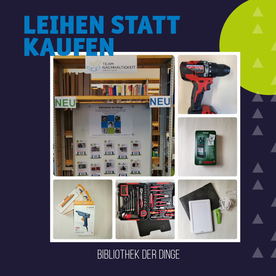 Mit der Bibliothek der Dinge haben wir Anregungen des Teams Nachhaltigkeit aufgegriffen und möchten unter dem Motto „leihen statt kaufen“ einen Beitrag zu mehr Nachhaltigkeit an der Hochschule leisten.