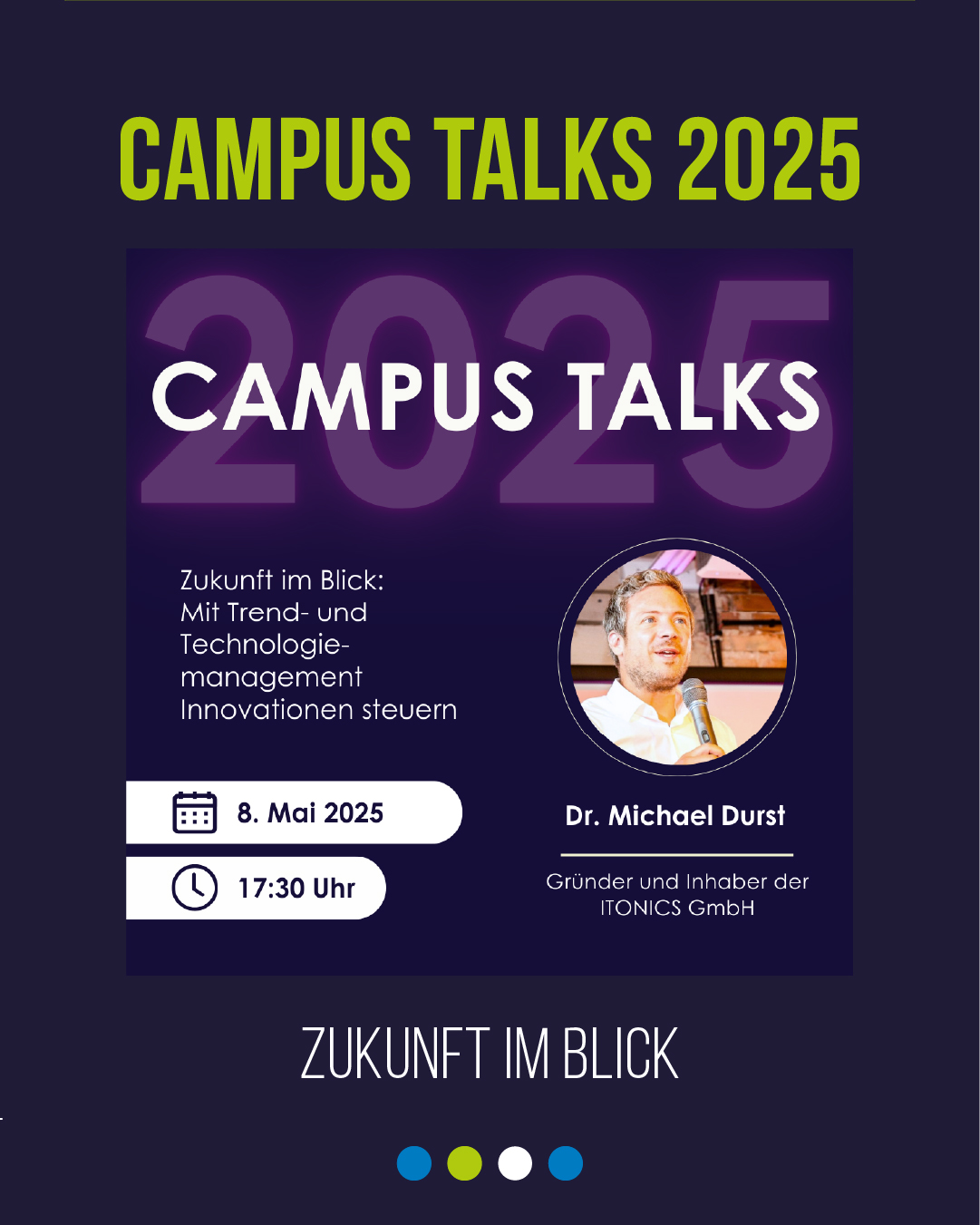 Im zweiten Campus Talk der Reihe „Innovationen steuern und gestalten“ erwartet Sie ein spannender Vortrag von Dr. Michael Durst, Gründer und CEO der ITONICS GmbH. Dr. Durst wird Einblicke in das integrierte Trend- und Technologiemanagement geben und zeigen, wie Unternehmen durch den gezielten Einsatz von Trend- und Technologie-Radaren ihre Innovationsportfolios systematisch steuern können.