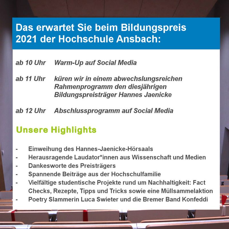Bei der Ehrung Bildungspreis der Hochschule Ansbach erwartet Sie ein buntes Programm zum Thema Nachhaltigkeit, Arten- und Umweltschutz. Der Hannes-Jaenicke-Hörsaal wird eingeweiht, Dr. Jane Goodall spricht, der Preisträger selbst natürlich auch.