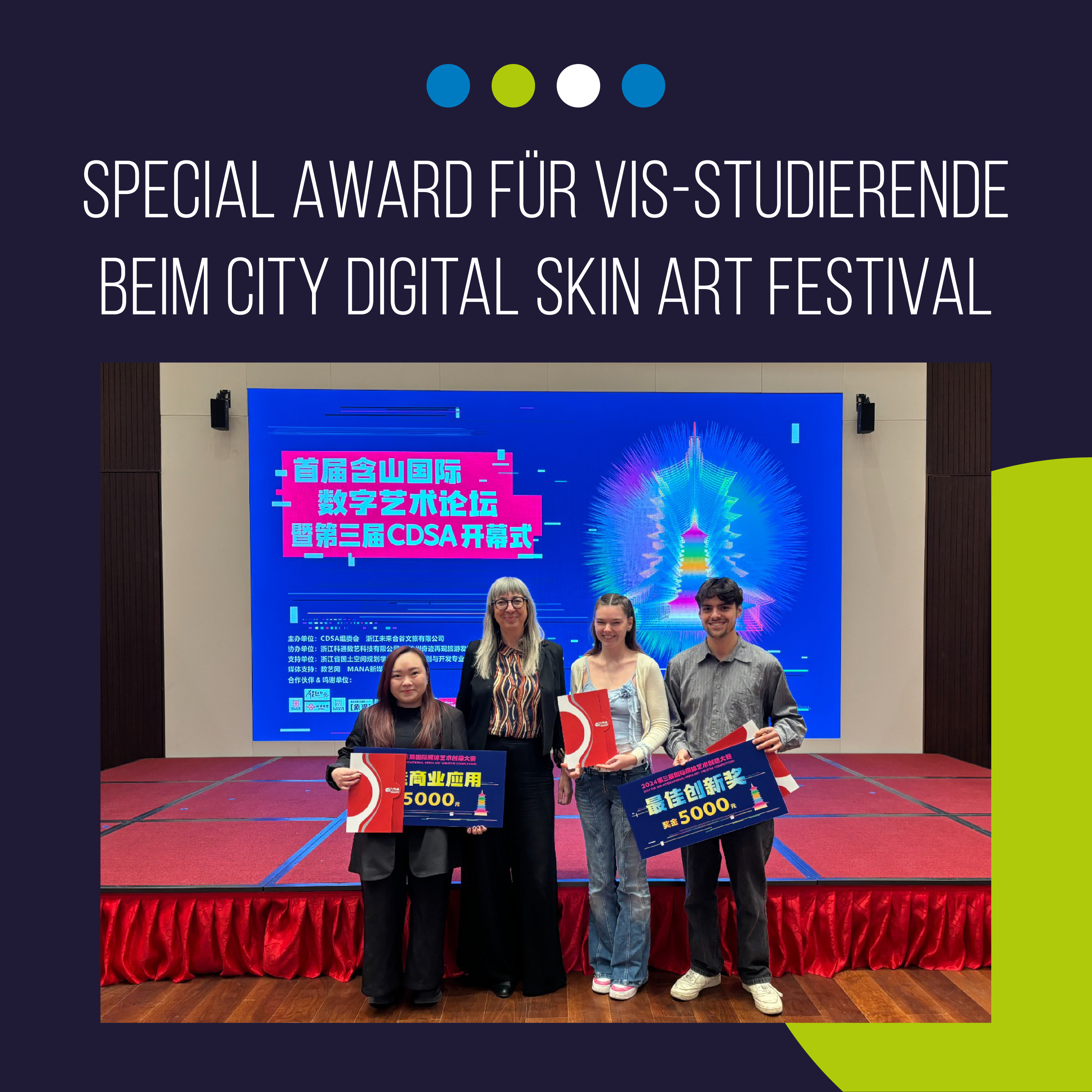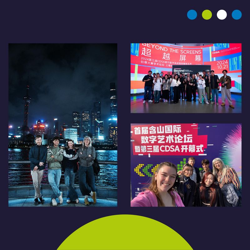 Im Oktober reisten Studierende aus dem Studiengang Visualisierung und Interaktion in digitalen Medien (VIS) unter der Leitung von Prof. Verena Kraemer nach China, um ihre preisgekrönten Videoarbeiten auf großen LED-Flächen in Shanghai und Shenzhen zu präsentieren. Die beiden Teams beeindruckten die internationale Jury des renommierten City Digital Skin Art Festivals (CDSA) mit hyperrealistischen 3D-Illusionen, die für gebogene Großflächen-LEDs entwickelt wurden.