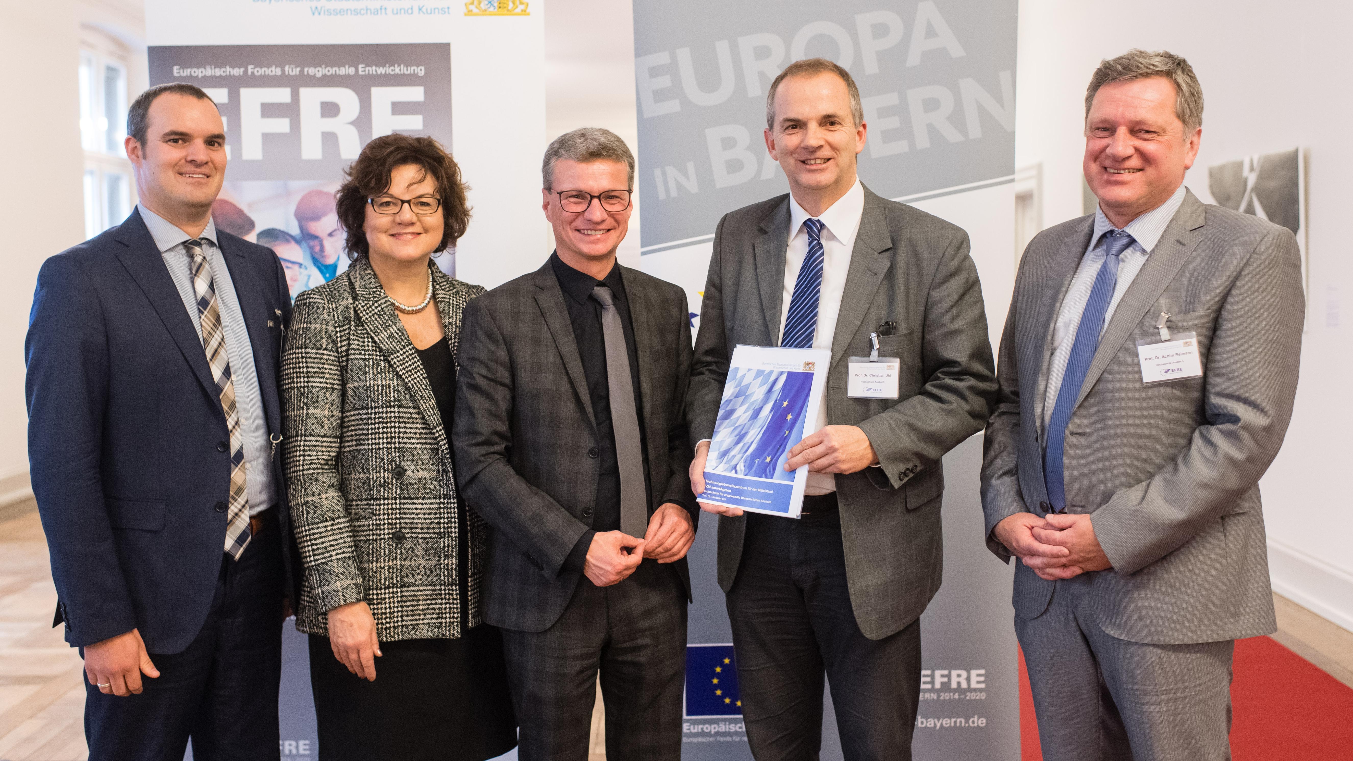 Das "TZM smart&green" an der Hochschule Ansbach hat von Wissenschaftsminister Bernd Sibler einen EU-Fördergeldbescheid für Technologietransfer erhalten. Bei der Übergabe betonte Sibler besonders, wie wichtig es sei, dass kleine und mittlere Unternehmen unmittelbar von neuesten Technologien profitieren.