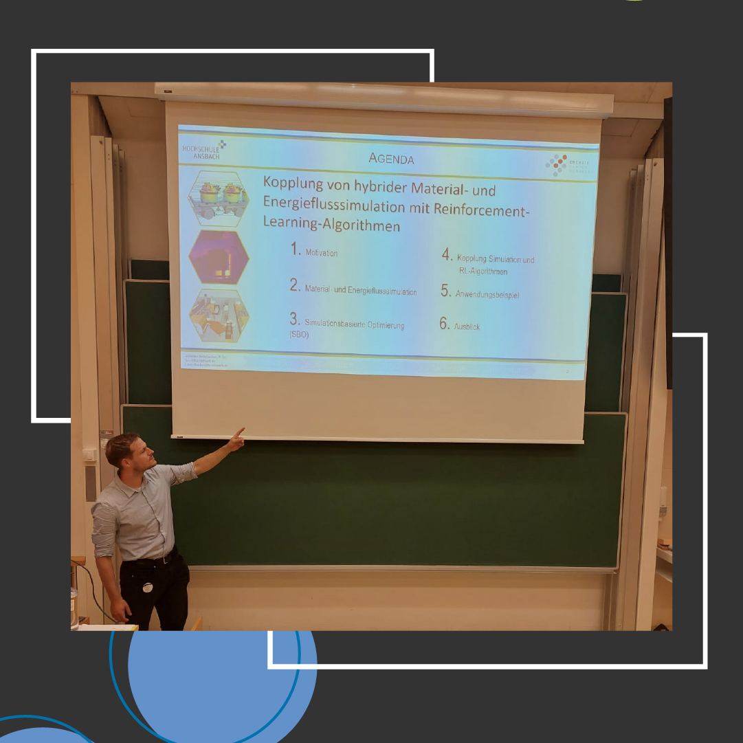 Auf der Fachtagung an der Technischen Universität Wien präsentierte er seinen Beitrag „Kopplung von hybrider Material- und Energieflusssimulation mit Reinforcement-Learning-Algorithmen“. Darin zeigte er auf, wie sich die Simulationsmodelle mit Künstlicher Intelligenz verbinden lassen und welche Schnittstellen im laufenden Forschungsvorhaben noch weiter untersucht werden.