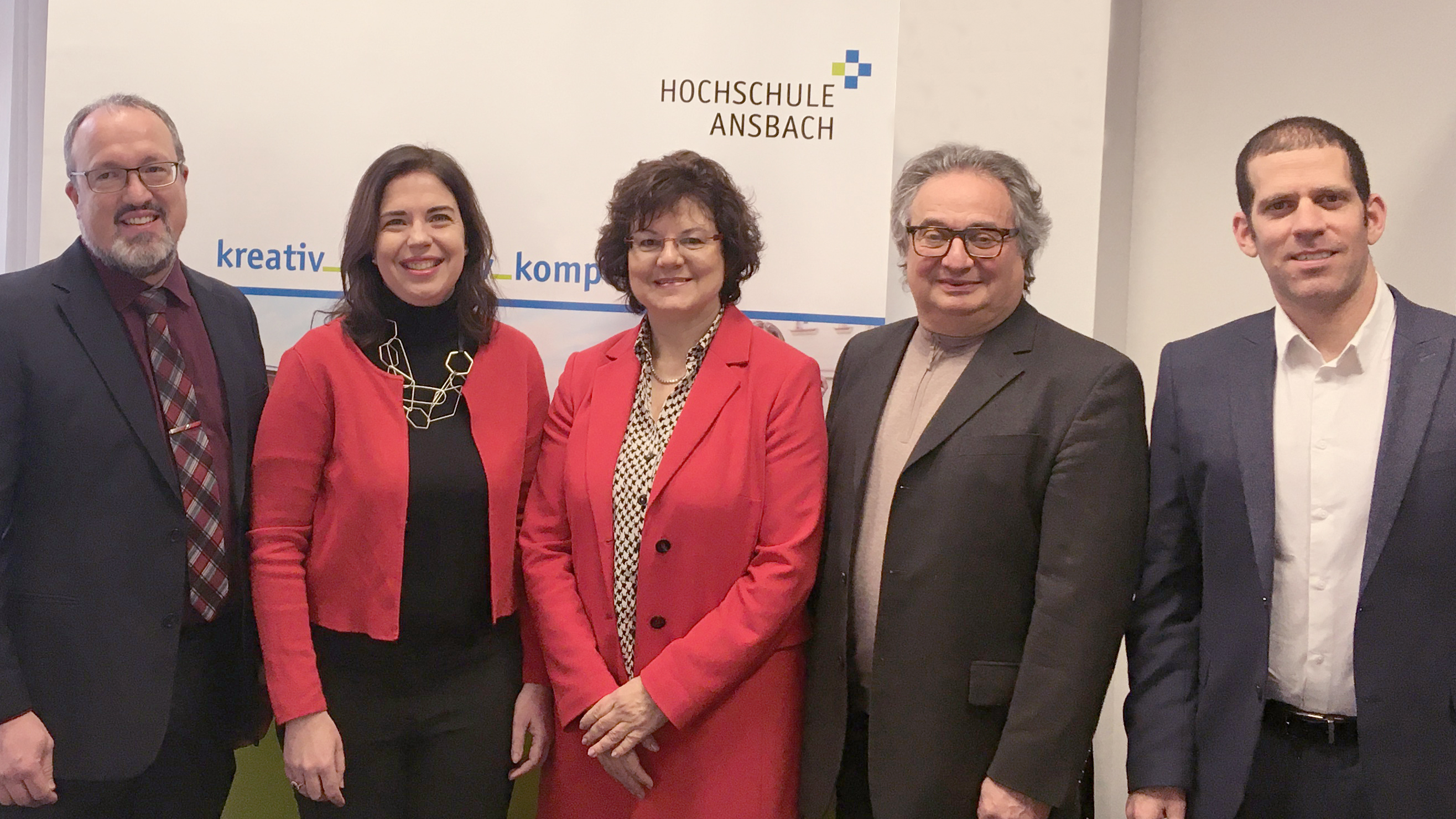 Die israelische Generalkonsulin Sandra Simovich stattete der Hochschule Ansbach vergangene Woche einen Besuch ab. In Gesprächen mit der diplomatischen Vertreterin festigte die Präsidentin der Hochschule, Frau Prof. Dr. Ute Ambrosius gemeinsam mit weiteren Vertretern der Hochschulleitung eine Kooperation mit israelischen Hochschulen. Diese beinhaltet die Möglichkeit, ein Praxissemester im Land an der Mittelmeerküste zu absolvieren und den Austausch von Studierenden und Professor*innen zu realisieren.