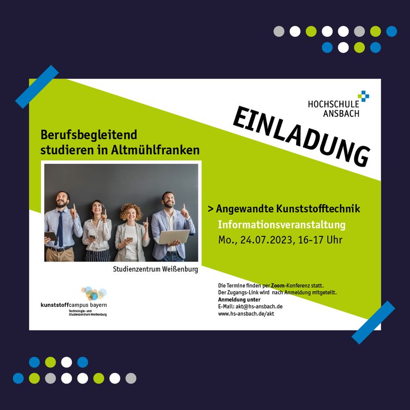 Am 24 Juli findet um 16 Uhr eine Informationsveranstaltung zu unserem berufsbegleitenden Bachelor „Angewandte Kunststofftechnik“ (AKT) online via Zoom statt. Hierzu möchten wir alle Interessierten herzlich einladen! Sie haben die Möglichkeit, sich hier oder per E-Mail an akt(at)hs-ansbach.de anzumelden. Den Zoom-Zugangslink erhalten Sie nach erfolgreicher Anmeldung.