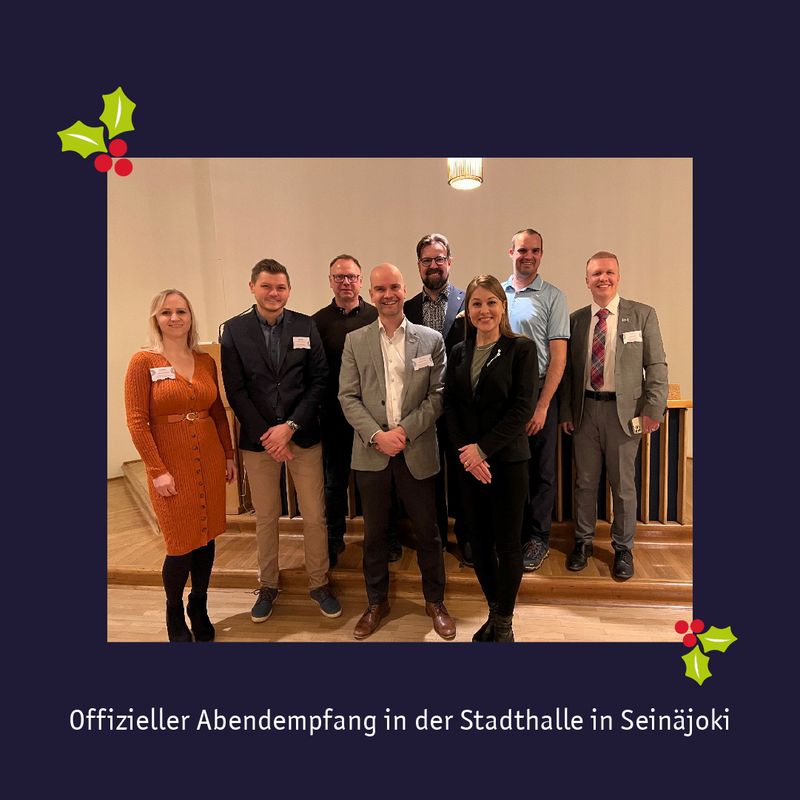 Das Bild zeigt die Mitarbeitenden der Hochschule Ansbach beim offiziellen Abendempfang in der Stadthalle. Von links nach rechts: Charlotte Kätzel (Servicecenter für digitale Lehre und Didaktik), Daniel Schultheiß und Robert Nierlich (Fakultät Technik), Heikki Rasku (Dekan der Fakultät Technology and Business), Jaakko Kiiskilä (Bürgermeister von Seinäjoki), Piia Kattelus-Kilpeläinen (Politikerin vor Ort), Philipp Häfner (Fakultät Technik) und Dr. Jaakko Hallila (Präsident der SeAMK).