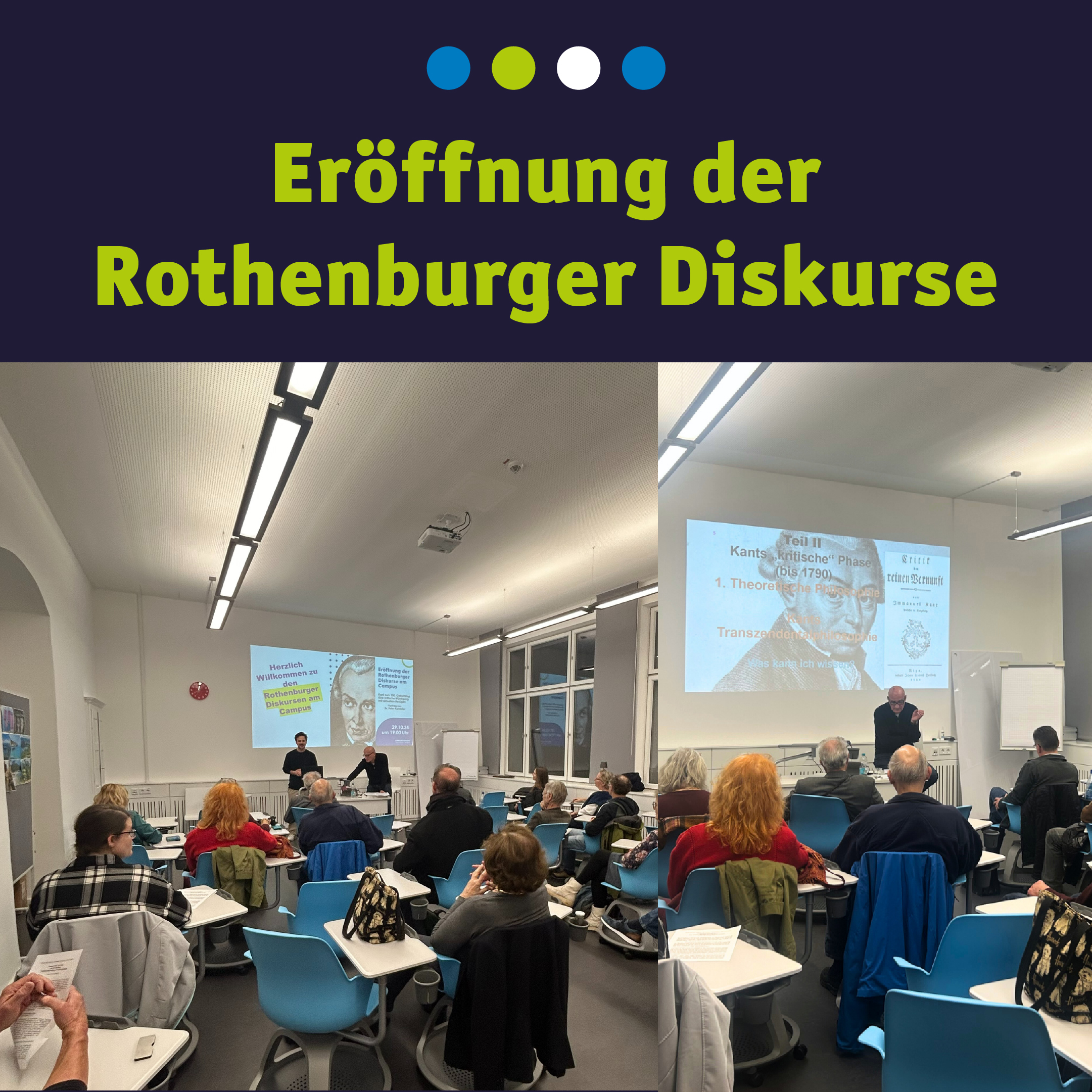 Am 29. Oktober startete die neue Veranstaltungsreihe „Rothenburger Diskurse am Campus“. Und es war ein sehr inspirierender Abend! Dr. Peter Kamleiter, Philosoph und ehem. Leiter der städt. Musikschule, entführte die Gäste in die Gedankenwelt von Immanuel Kant und veranschaulichte eindrucksvoll, warum die Philosophie des berühmten Denkers auch heute nach 300 Jahren noch nichts an Relevanz verloren hat.