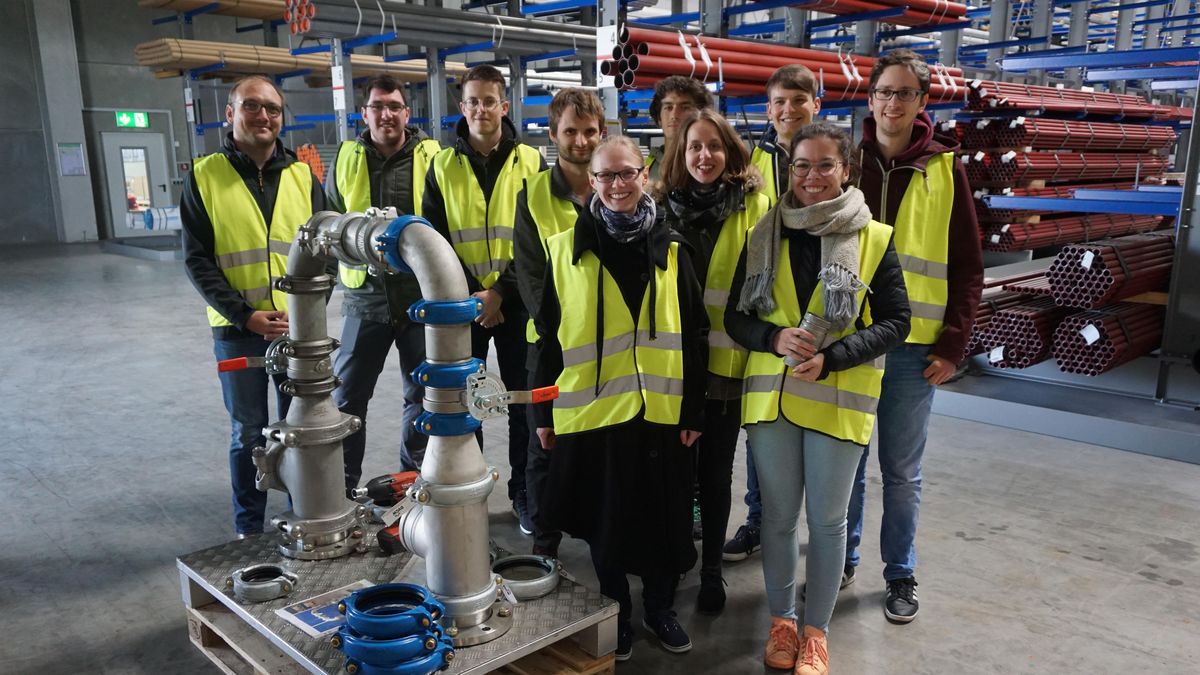 Wie Rohrsysteme sicher, einfach und effizient für Heizungs-, Abwasser- und Nahwärmesysteme montiert werden können, erläuterte Frank Börstel von der Firma Victaulic in seiner Präsentation. Der besondere Clou seines Systems ist, dass auf herkömmliche und aufwendige Rohrverbindungsmethoden wie das Schweißen verzichtet werden kann. Am Ende hatte Börstel für die Studierenden dann auch noch eine Aufgabe vorbereitet. Sie sollten in möglichst kurzer Zeit eine hydraulische Rohrleitungsbrücke bauen und testen. Das studentische Team löste diese sehr anspruchsvolle Aufgabe im Team mit Bravour.
