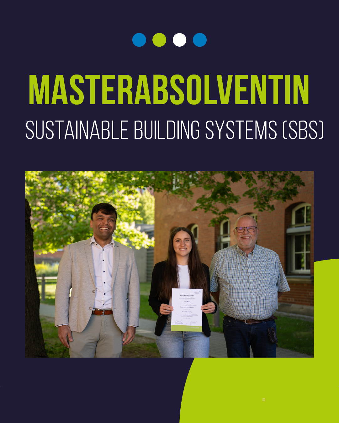 Wir gratulieren der ersten Absolventin des Sustainable Building Systems (SBS) Frau Regina Weger herzlich zum erfolgreichen Abschluss! In ihrer Masterarbeit widmete Sie sich der Nachhaltigkeitszertifizierung von Gebäuden – ein Thema von großer Relevanz für die nachhaltige Transformation der Bau- und Immobilienbranche.