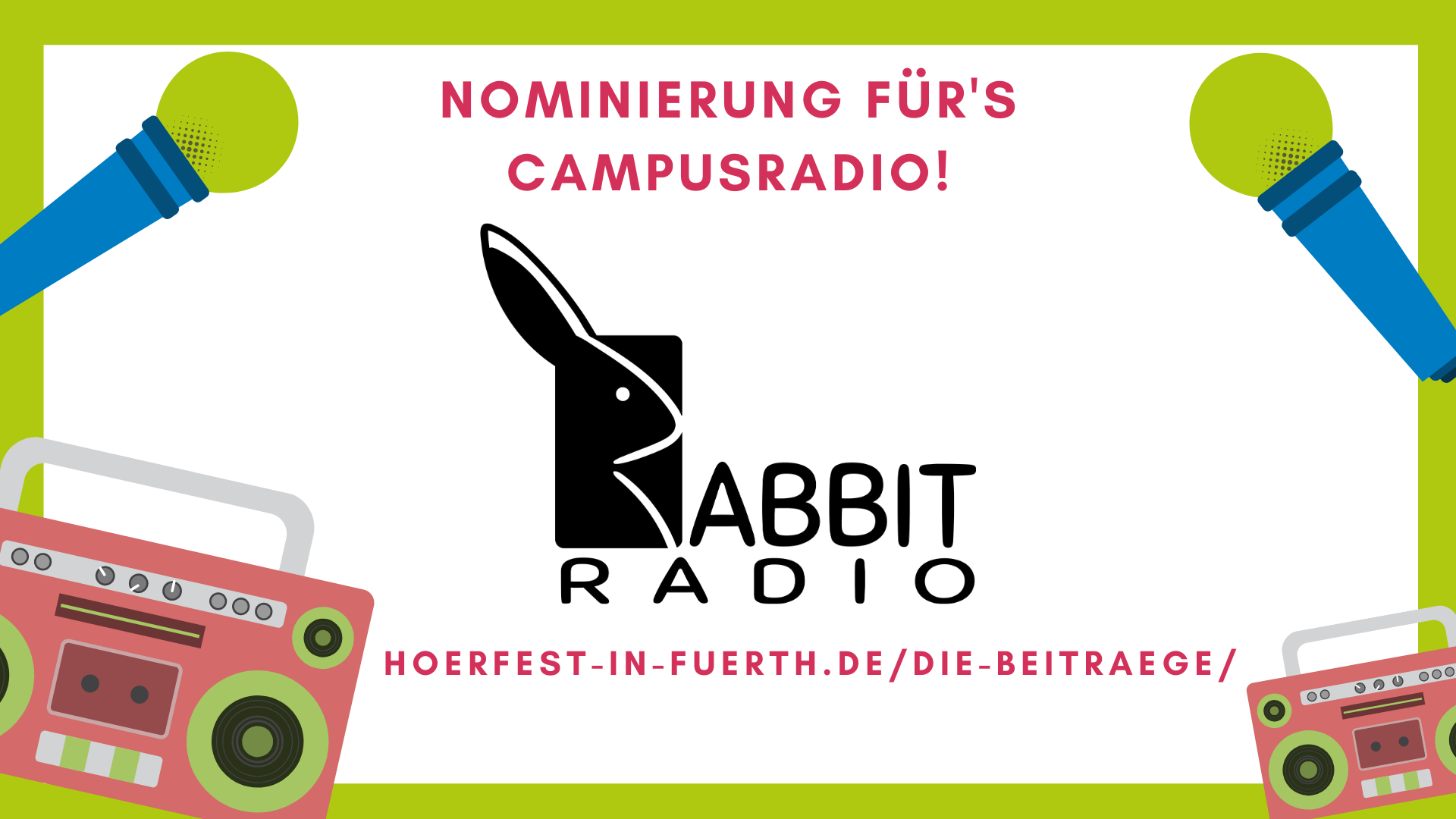 Das Campusradio Rabbit Radio ist mit zwei Beiträgen beim diesjährigen Hörwettbewerb „Hört Hört“ nominiert. Jedes Jahr zeichnet der Preis junge Menschen aus ganz Franken für ihre Audioproduktionen aus. Unter der Leitung von Prof. Dr. Thomas Liesen strahlt der Sender jeden zweiten Donnerstag im Monat auf Radio Max Neo aus.
