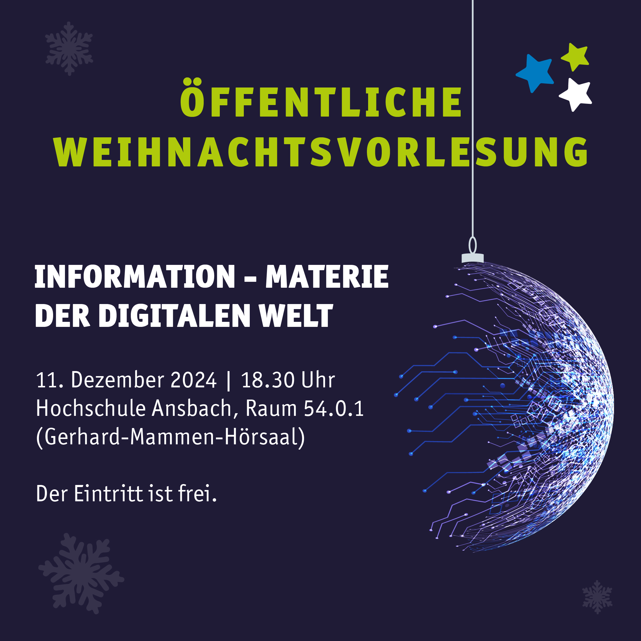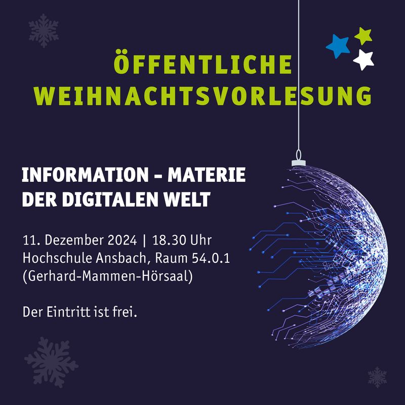 Am kommenden Mittwoch, den 11. Dezember um 18:30 Uhr, lädt die Hochschule Ansbach zur traditionellen Weihnachtsvorlesung in Raum 54.0.1 ein. Der populärwissenschaftliche Vortrag mit dem Titel „Information – Materie der Digitalen Welt“ bietet allen Interessierten eine unterhaltsame und gleichzeitig tiefgründige Einführung in die Bedeutung von Information und deren Rolle in der digitalen Welt.