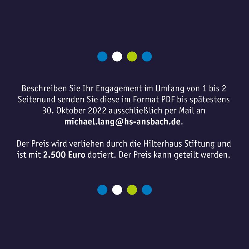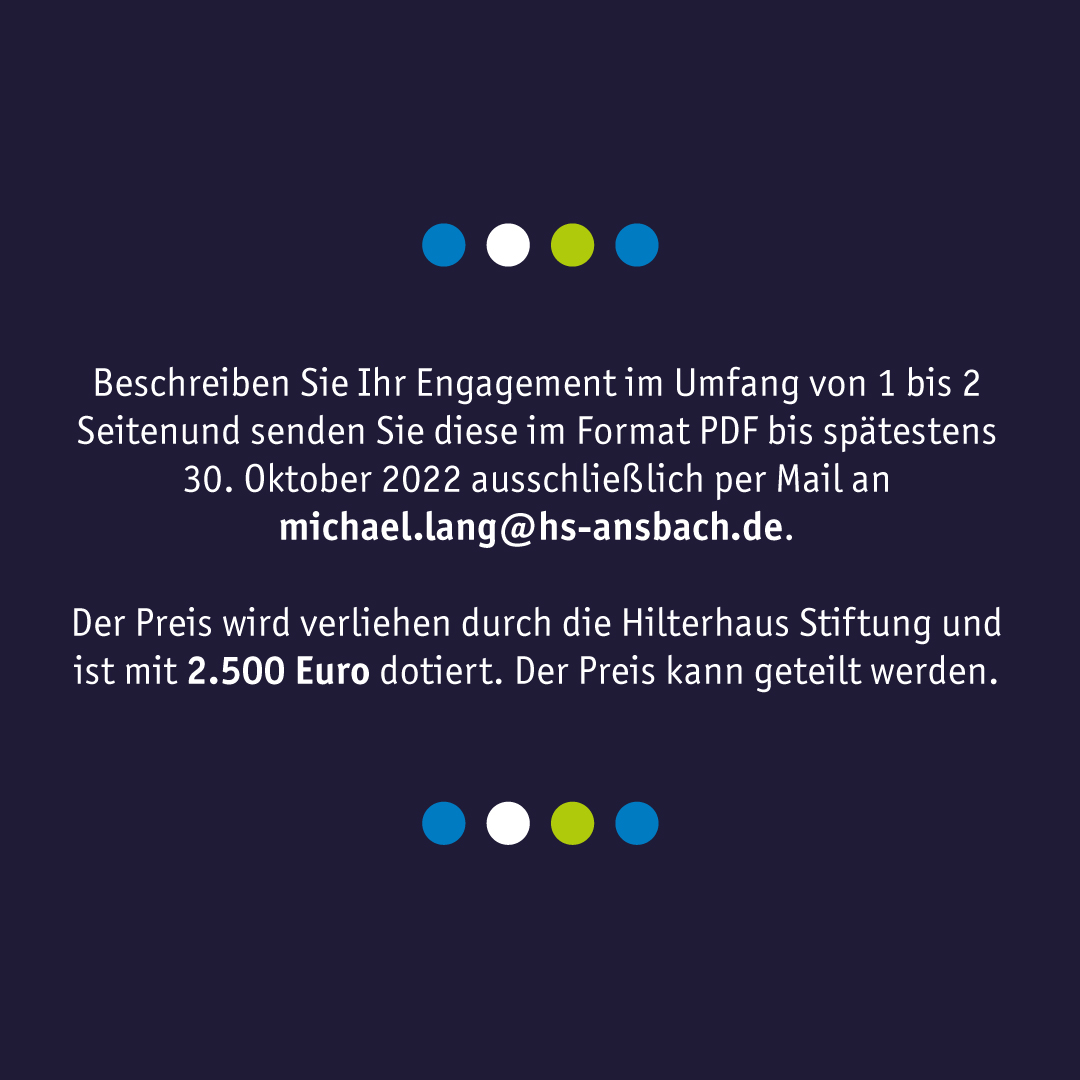 Um sich zu bewerben schicken Sie eine kurze Beschreibung Ihres sozialen Engagements per E-Mail an Michael Lang (michael.lang(at)hs-ansbach.de). Bewerbungsschluss ist der 30. Oktober 2022. Es werden ausschließlich Bewerbungen berücksichtigt, die aus 1-2 DIN A4-Seiten bestehen und als PDF geschickt werden.