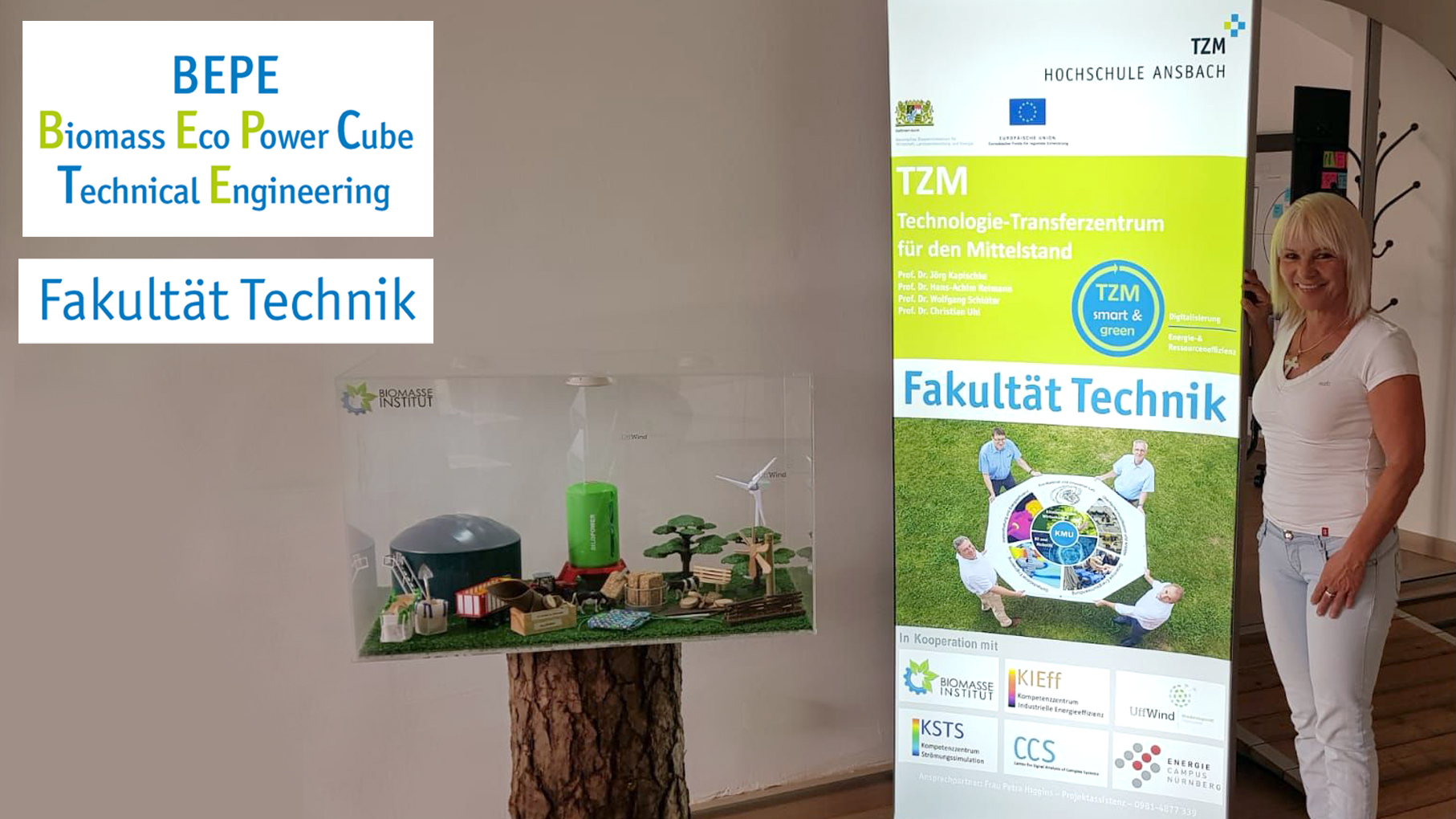 Ein neues Projekt der Fakultät Technik wurde jetzt am Pixel Campus in der Ansbacher Innenstadt ausgestellt. Petra Higgins, Projektassistentin am Biomasse Institut sowie am Technologie-Transferzentrum für den Mittelstand (TZM smart&green), stellte das von ihr gestaltete Ausstellungsstück für das Biomasse Institut Ansbach sowie ein neues Projekt-Rollup für das "TZM smart&green - Digitalisierung und Energieressourceneffizienz" vor.