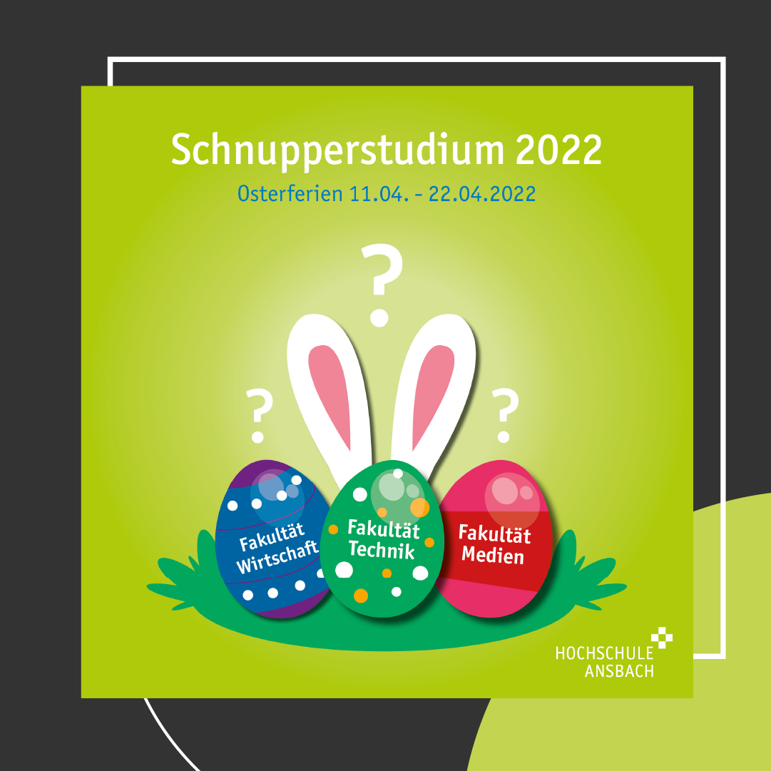 Bereits zum zweiten Mal veranstaltet die Hochschule Ansbach ein Schnupperstudium. Von Montag, 11. April, bis Freitag, 22. April, können Studieninteressierte die Hochschule und ihre verschiedenen Studiengänge besser kennenlernen. Sie können an verschiedenen Vorlesungen teilnehmen. So bekommen Interessierte einen Einblick in unsere drei Fakultäten Medien, Technik und Wirtschaft.