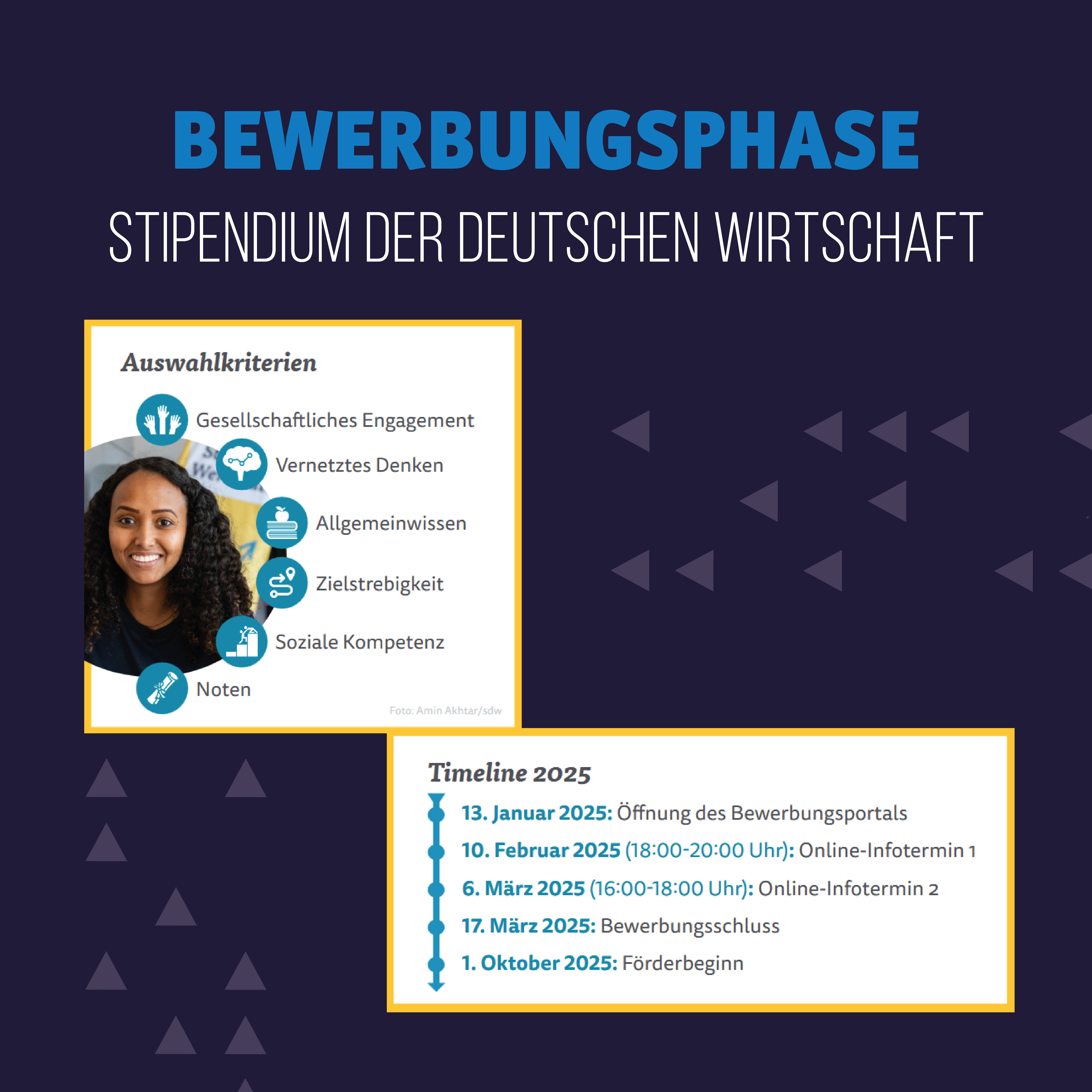 In zwei Online-Infoabenden am Montag, den 10. Februar 2025, um 18:00 Uhr und Donnerstag, den 06. März 2025, um 16:00 Uhr werden alle Fragen rund um das Stipendium geklärt.