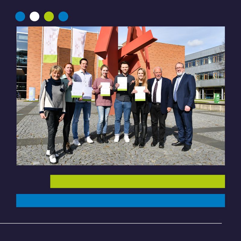 Im Bild (v.l.n.r.): Studiengangsleiterin Prof. Renate Hermann, Studierende Sonja Och, Nikolas Pfeil, Jennifer Kunze, Sebastian Frost und Selina Heidig, Dozent Manfred Krone, Hochschulpräsident Prof. Dr.-Ing. Sascha Müller-Feuerstein