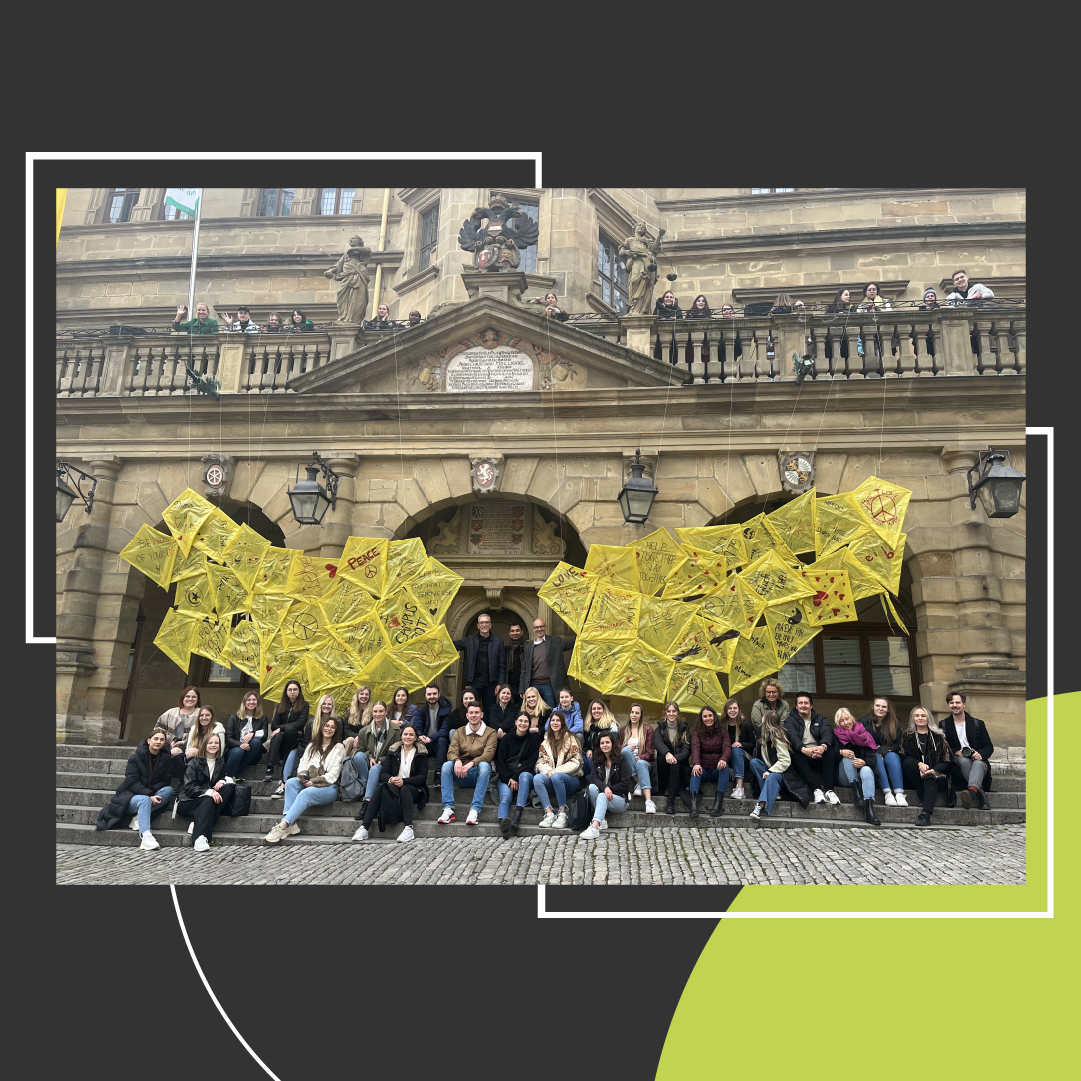 Die Studierenden haben Drachen gebastelt und diese mit ihren persönlichen Wünschen und Botschaften bestückt. Darunter waren "Make Art Not War", Peace oder auch #positivevibes. Zum Abschluss wurden die Drachen zu zwei großen Flügeln zusammengesetzt und am Rathaus in der Innenstadt von Rothenburg aufgehängt.