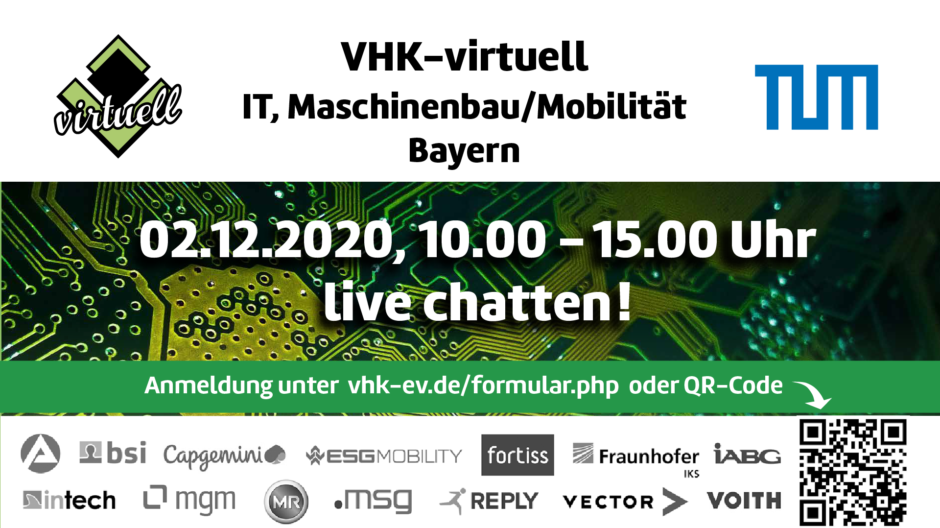 Am 2. Dezember haben Studierende und alle Interessierten die Möglichkeit, bei der VHK-virtuell „IT, Maschinenbau / Mobilität“ Kontakte zu IT-Firmen und Maschinenbau- sowie Mobilitätsunternehmen zu knüpfen – und das komplett online! Besonderes Augenmerk liegt dabei auf zukünftigen Praktika, Stellen für Abschlussarbeiten, Werkstudenten- oder Einstiegsjobs.