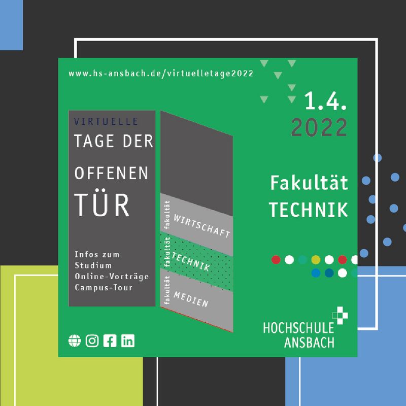 Tag drei unserer virtuellen Tage der offenen Tür steht an: Morgen ist die Fakultät Technik an der Reihe. In verschiedenen Zoom-Vorträgen stellen Dozierende die technischen Bachelor- und Masterstudiengänge der Hochschule Ansbach vor.
