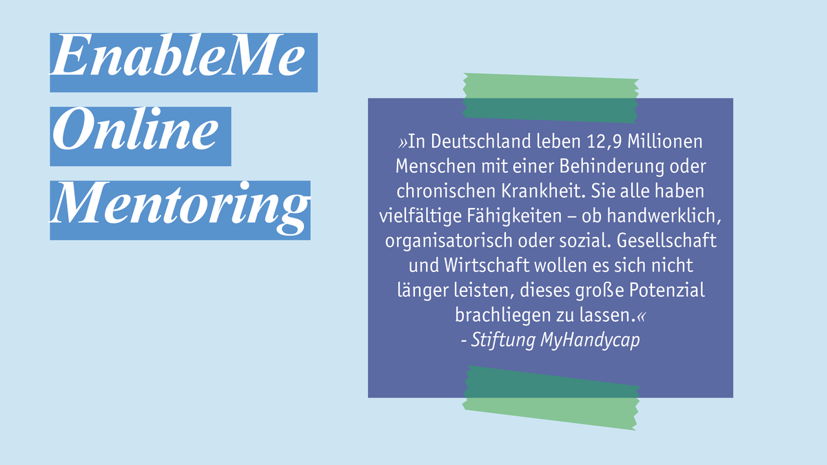 Die Stiftung MyHandicap hat gemeinsam mit Volunteer Vision das Projekt EnableMe Online-Mentoring in die Welt gesetzt: ein Job- und Bewerbungscoaching für Menschen mit körperlicher Beeinträchtigung und/oder chronischer Krankheit.